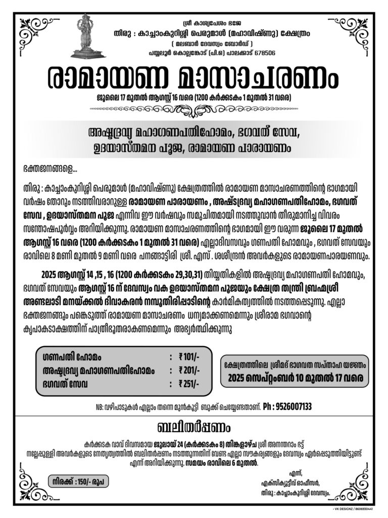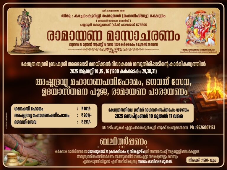 ‘Karkkidakam’ (17Jul-Aug16, 2025), the last month of the Malayalam calendar is a month of dark clouds and heavy rain. In a traditionally agrarian society, this month is considered to be a period of scarcity. In order to get over this period of darkness, it has been customary in households to recite the Ramayana, on a daily basis in front of a ‘Deepam’. Like-wise, Pujas and readings are an intrinsic part of temple activity during this month – giving ‘Karkkidakam’ the distinction of being referred to as ‘Ramayana Maasam’.